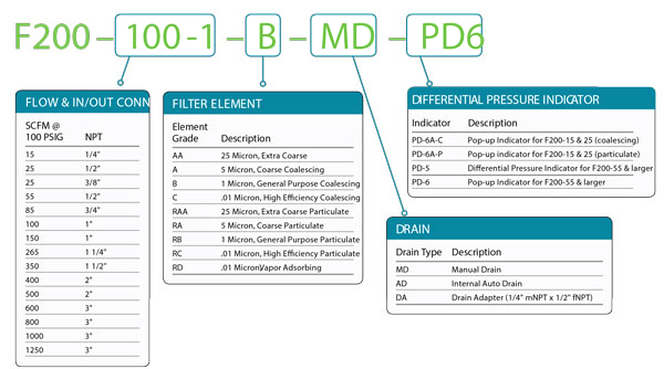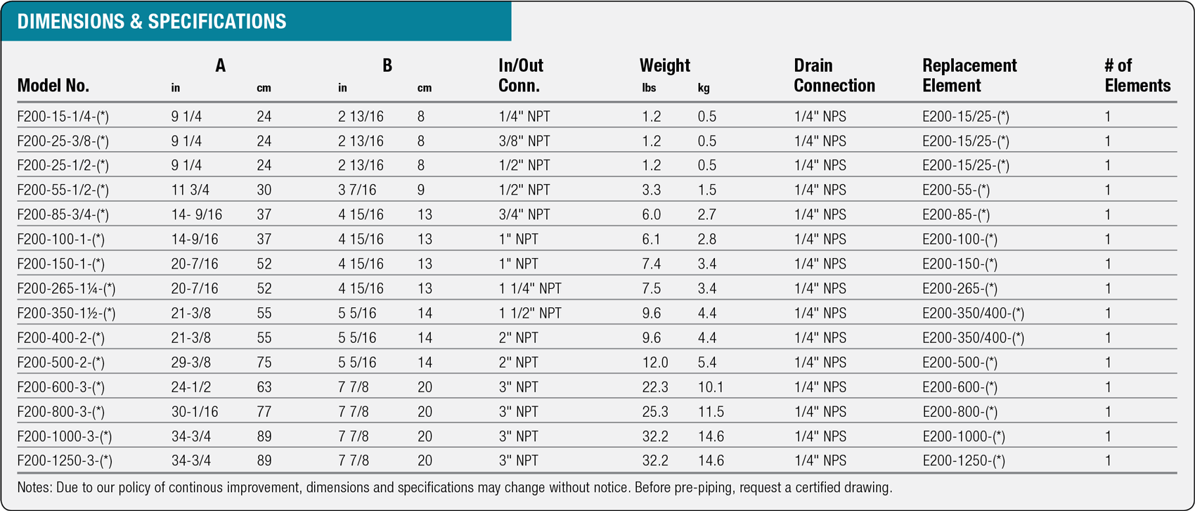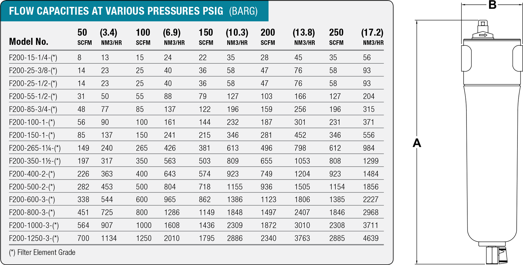 The F200 Series includes housings with connection sizes from ¼” to 3” NPT for flow rates from 15 to 1250 SCFM (at 100 PSIG) and nine filtration grades to meet your exact system requirements. All F200 series filters have a maximum working pressure of 250 PSIG. F200 filters are approved for the use with both compressed air and hydrocarbon gases.